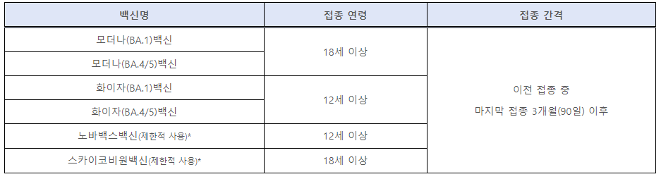 * mRNA 2가백신 4종 : 화이자 BA.1, 화이자 BA.4/5, 모더나 BA.1, 모더나 BA.4/5