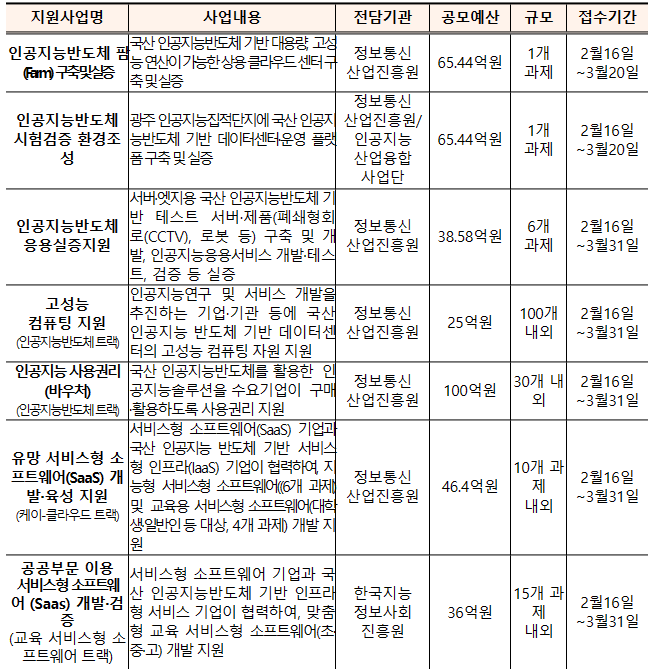 ** ’인공지능반도체 팜 구축 및 실증’은 안전·보건·교육·국방 중 2건 이상, ‘인공지능반도체 시험검증 환경조성‘은 상기 4개에 자율주행·에너지(지역특화산업)를 포함한 6개 분야 중 4건 이상