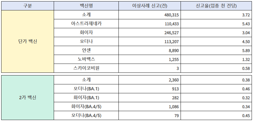 - (백신별) 기존 단가 백신접종 129,142,193건 중 이상사례는 480,315건이 신고되어 신고율은 3.72건(접종 천 건당)이었고, 2가백신 접종 6,252,762건 중 이상사례는 2,360건이 신고되어 신고율은 0.38건(접종 천 건당)이었다.