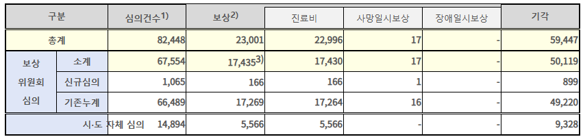 ○ 한편, 본인부담금 기준 30만 원 미만의 소액 진료비 보상신청건 중 14,894건은 신속한 심의를 위해 시·도에서 자체 심의를 거쳐 5,566건이 보상 결정되었다.