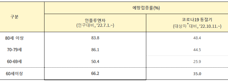 □ 코로나19 예방접종 대응 추진단(단장 지영미 청장, 이하 ‘추진단’)은, 60세 이상 연령층에 위중증·사망이 집중되고 있으나, 동절기 추가접종률은 인플루엔자(계절독감) 보다 크게 낮은 것으로 나타났다고 밝혔다.