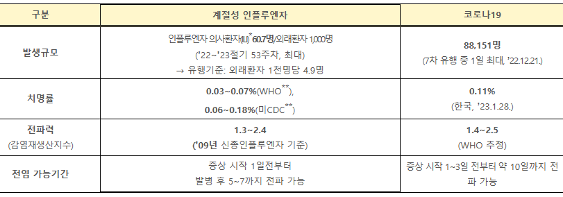 < 코로나19 - 인플루엔자 비교 (2022-2023절기 인플루엔자 관리지침) >