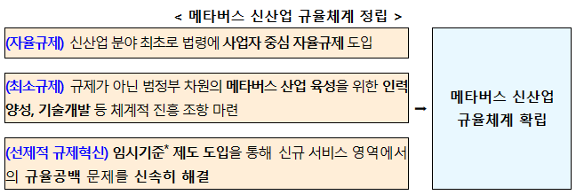 이에 과기정통부는 지난 2022년 5월부터 산·학·연·관 협업체계*를 구축하여 메타버스 기술·서비스의 특징과 연관된 규제이슈를 분석했다. 신산업 특성을 고려하여 ‘선허용-후규제’를 원칙으로 하는 포괄적 네거티브 규제체계에 따라 민간 중심의 ‘자율규제’, 초기단계인 산업 여건을 고려한 ‘최소규제’, 기술·서비스의 발전을 저해하지 않도록 하기 위한 ‘선제적 규제혁신’이라는 세 가지 기본원칙을 세웠다.