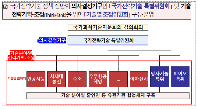 국가과학기술자문회의(의장 : 대통령) 산하의 국가전략기술 특별위원회는 범부처 국가전략기술 주요 정책을 심의·조정하고, 전략기술 연구개발 관련 산·학·연 협력의 구심점 역할을 수행한다.